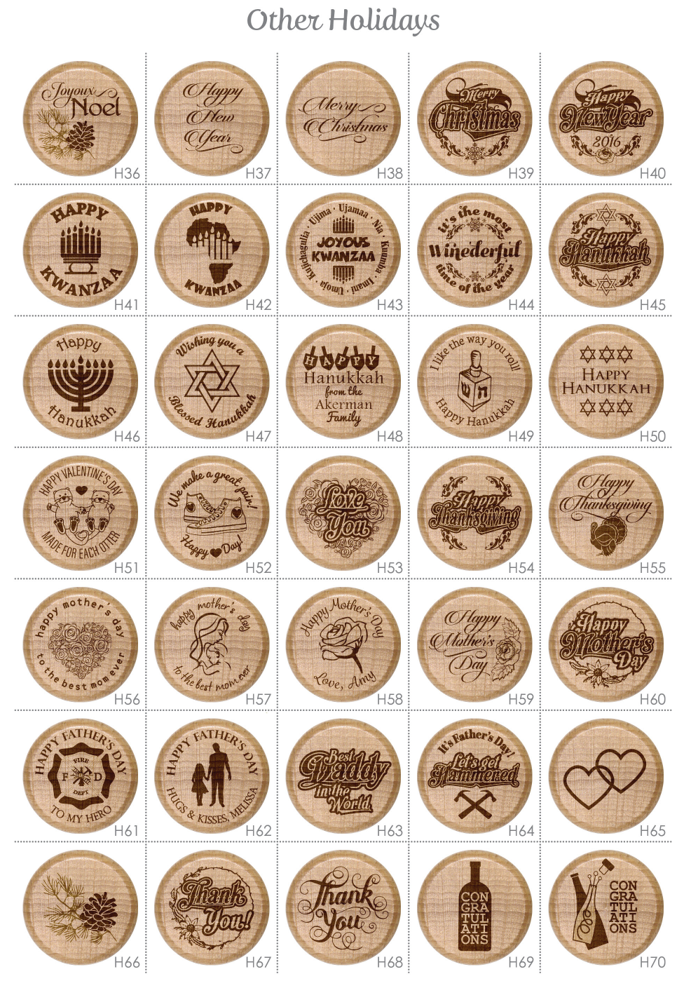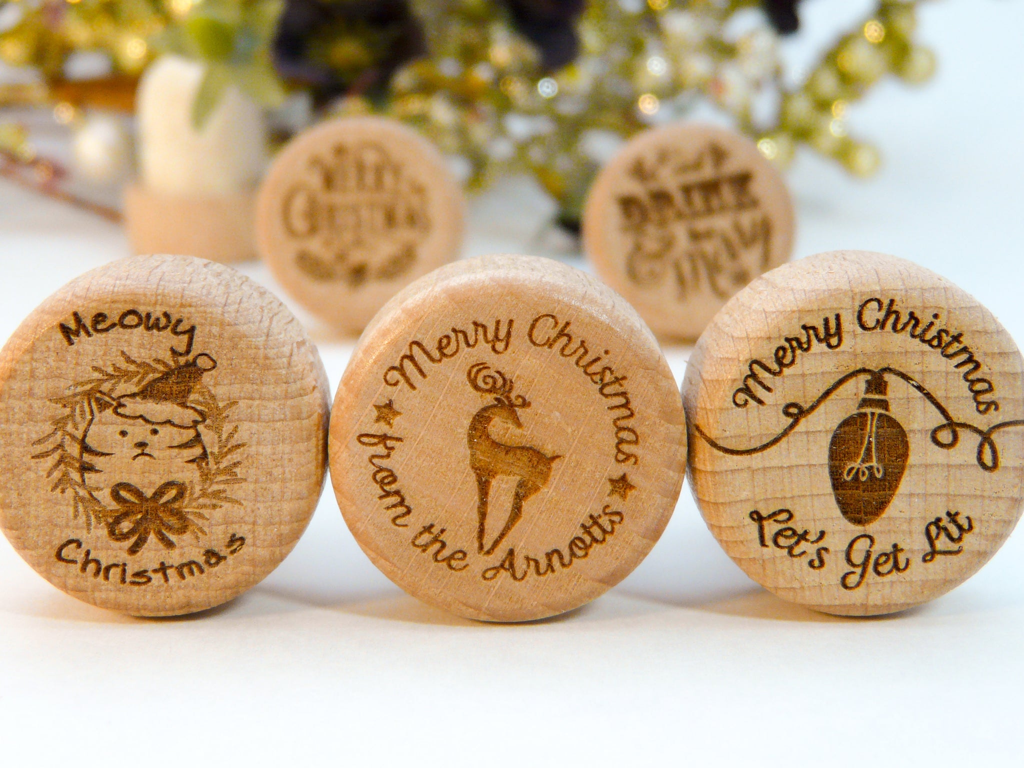 Holiday Wine Stoppers - Bottle corks are reusable t-cork style laser engraved with personalized information. Custom toppers are perfect favors for holiday get-togethers. Whether you add to your gifts as a special touch or add to a bottle of wine for a hostess gift, stoppers are great gifts for Christmas, Hanukkah, Kwanzaa, New Year, Valentine's Day, Mother's Day, Father's Day, Thanksgiving.