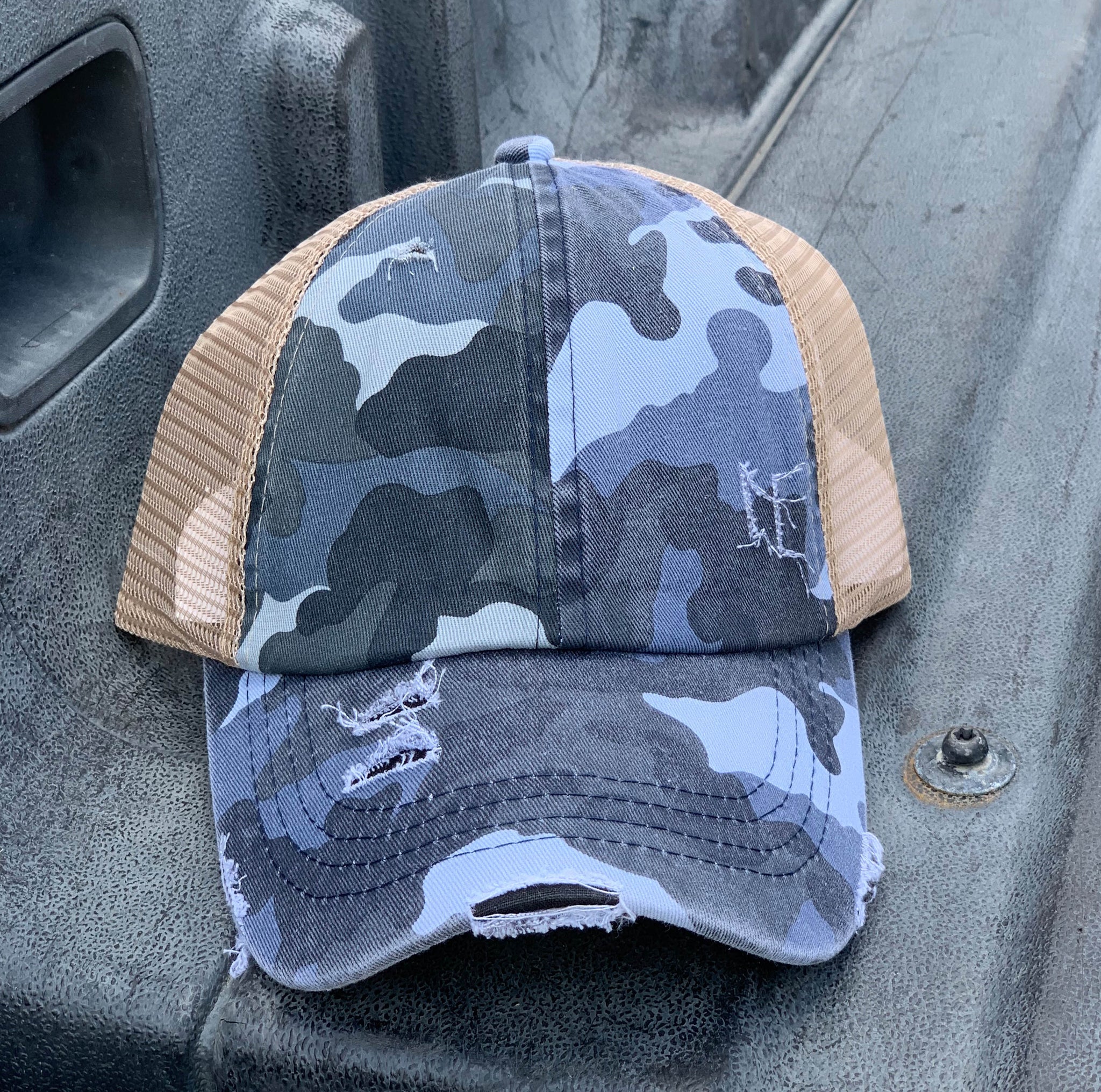 Auténtico camuflaje azul CC Beanie CrissCross High Ponytail Trucker Hat Camo Distressed Wash Denim