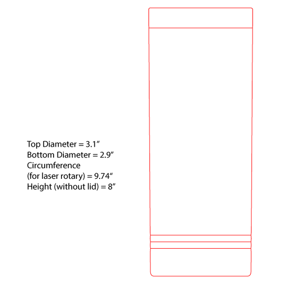 Our smallest lasers use a 24" x-axis, and all our rotary templates are built to those standards. You can copy and paste our files into your laser program for a nearly perfect 360 degree wrap. (For best results, we suggest a chuck-style rotary with a 2" or larger focal length. On handled items, you may need to remove air assist cones or nozzles to ensure the rotation of the handle will not hit your laser head.)