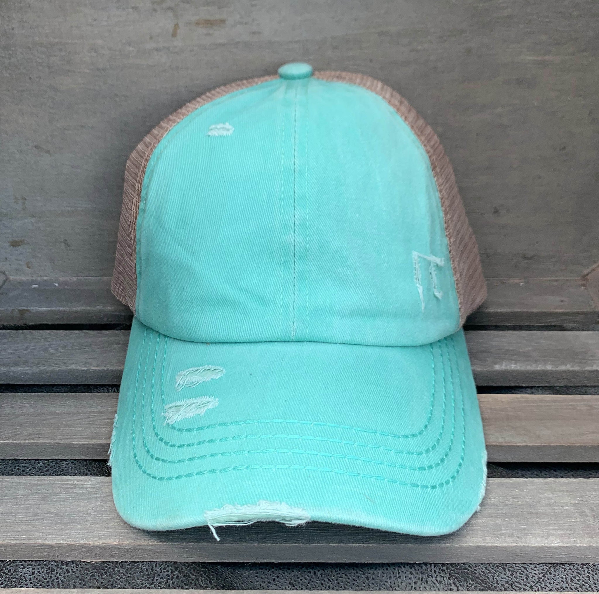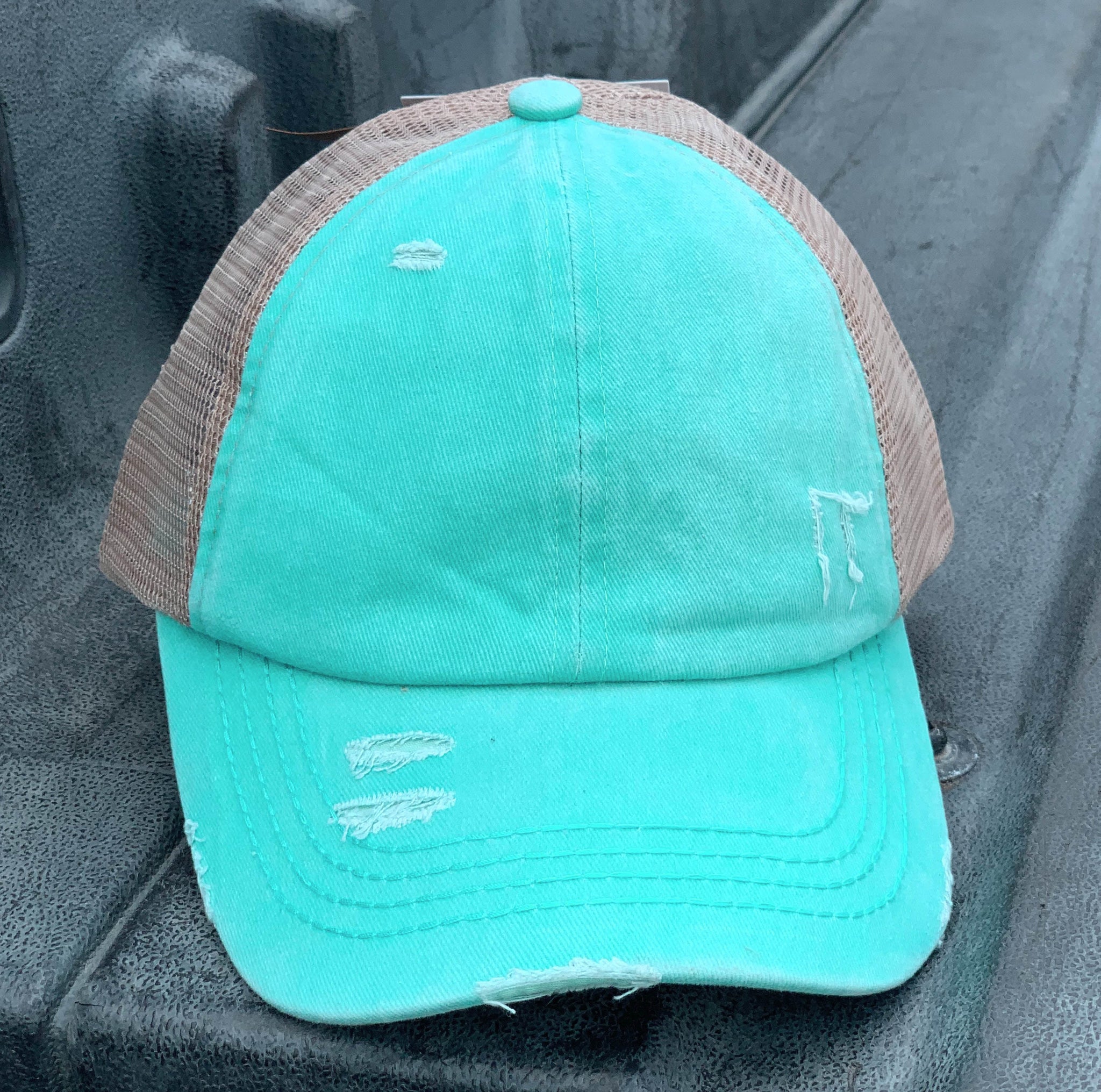 Authentic Mint C.C. Beanie High Ponytail CrissCross Trucker Cap is the perfect baseball cap with a unique criss cross design to allow high, medium, or low ponytails, or even looks super cute with your hair down. This item is genuine C.C. Beanie product, not a copy. Distressed wash finish with 6-panel unstructured construction. Usually ships same day if ordered by 2 pm CST, or ships next business day if ordered after that. (We don't ship on Saturday or Sunday.)